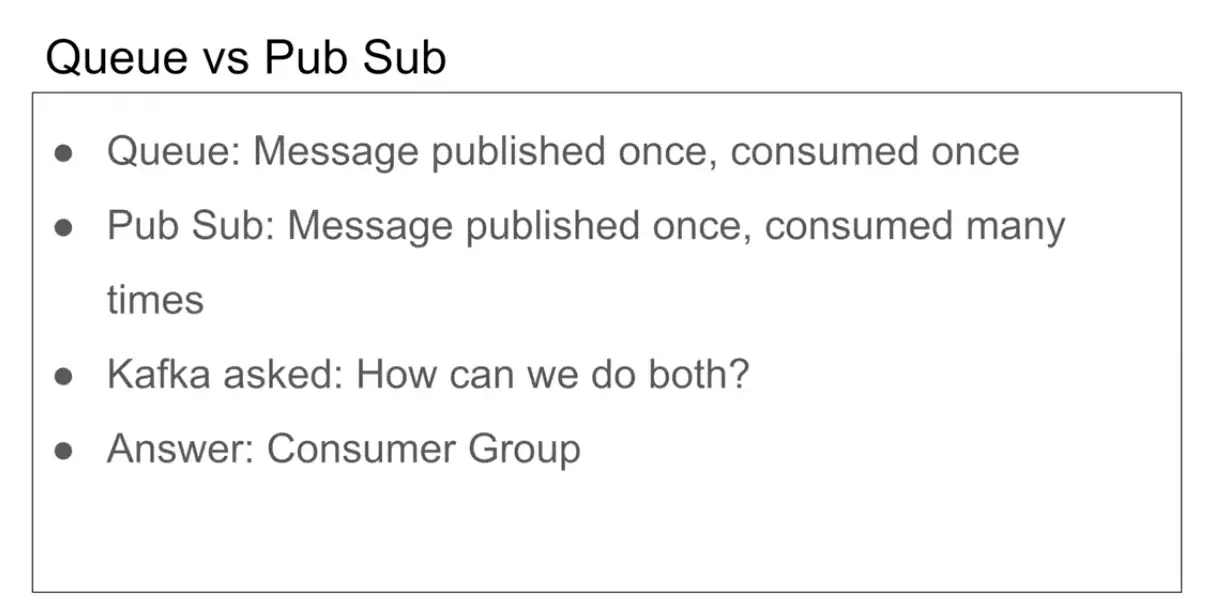 The key is that Kafka achieves both patterns through consumer groups: different consumer groups enable pub-sub, while consumers within the same group enable queue behavior.