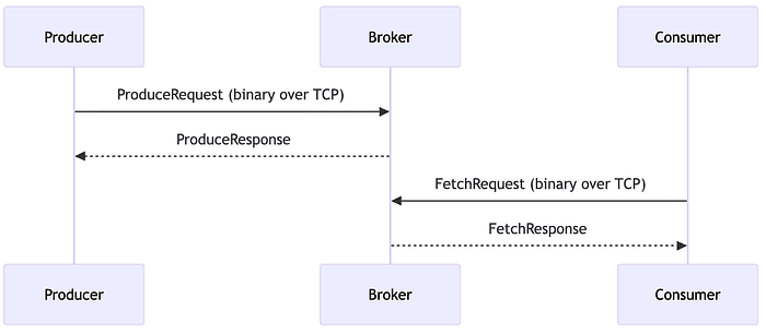 - Consumer also establish a TCP connection to the broker, using a custom binary protocol over TCP with the client initiating a direct socket connection to the broker to exchange request response message without requiring a complex handshake on the configured port